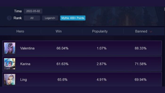 Berdarsarkan data yang dirilis oleh situs resmi Mobile Legends, hero tersebut mendapatkan banned sebesar 88,33% unggul sangat jauh dari Karina yang berada di posisi kedua dengan 71,58.