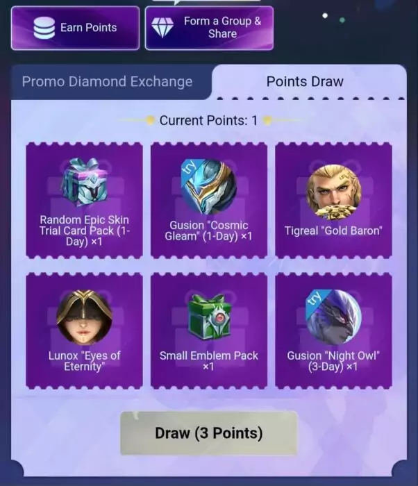 Kalian sendiri nantinya perlu menyelesaikan beberapa misi untuk mendapatkan point yang bisa ditukarkan baik dengan diamond kuning maupun kesempatan mendapatkan skin epic secara gratis.