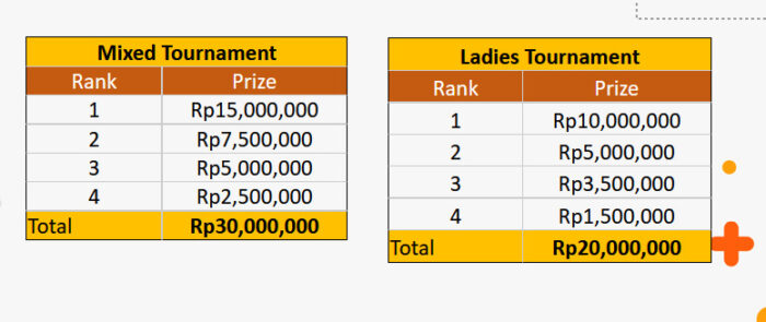 Pada turnamen ini, total 192 tim akan berkompetisi memperebutkan total hadiah Rp50.000.000,- dengan pembagian Rp30.000.000,- untuk kategori mixed dan Rp20.000.000,- pada kategori ladies.