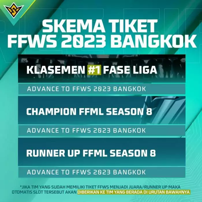 Namun jika ada tim yang sudah mendapatkan tiket menuju FFWS 2023 Bangkok entah menjadi Juara ataupun Runner Up maka otomatis slot akan diberikan ke tim yang berada di urutan dibawahnya.