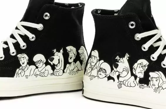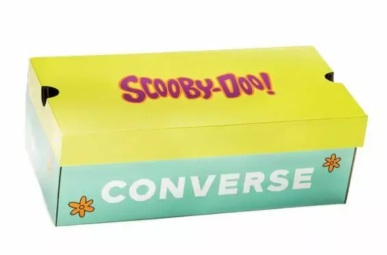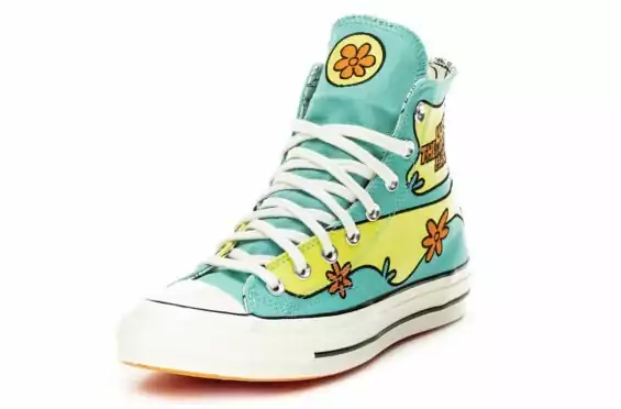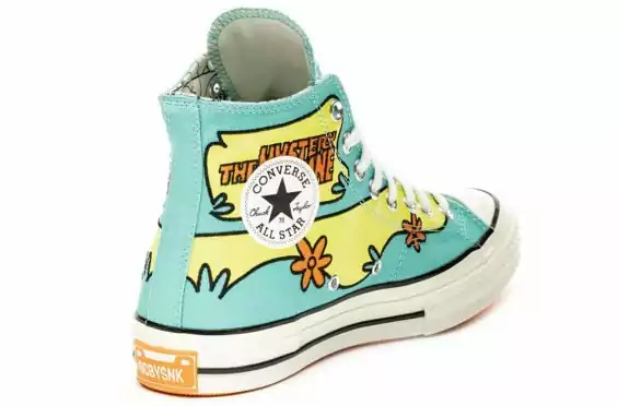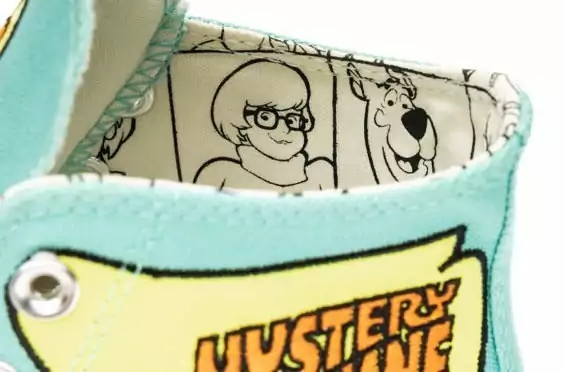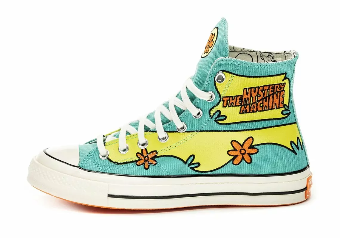 Pasangan pertama datang dalam warna biru dan hijau cerah yang dilengkapi dengan grafis bunga orange yang tampaknya memberi penghormatan kepada mobil van “The Mystery Machine” yang terkenal itu. Rincian lain pada sepatu termasuk stempel heel sepatu kiri yang mengganti branding Converse tradisional dan menggantinya dengan yang bertuliskan “SCBYSNK” singkatnya untuk “Scooby Snack”. Di dalam sepatu menampilkan gambar Hitam dan Putih dari karakter utama.